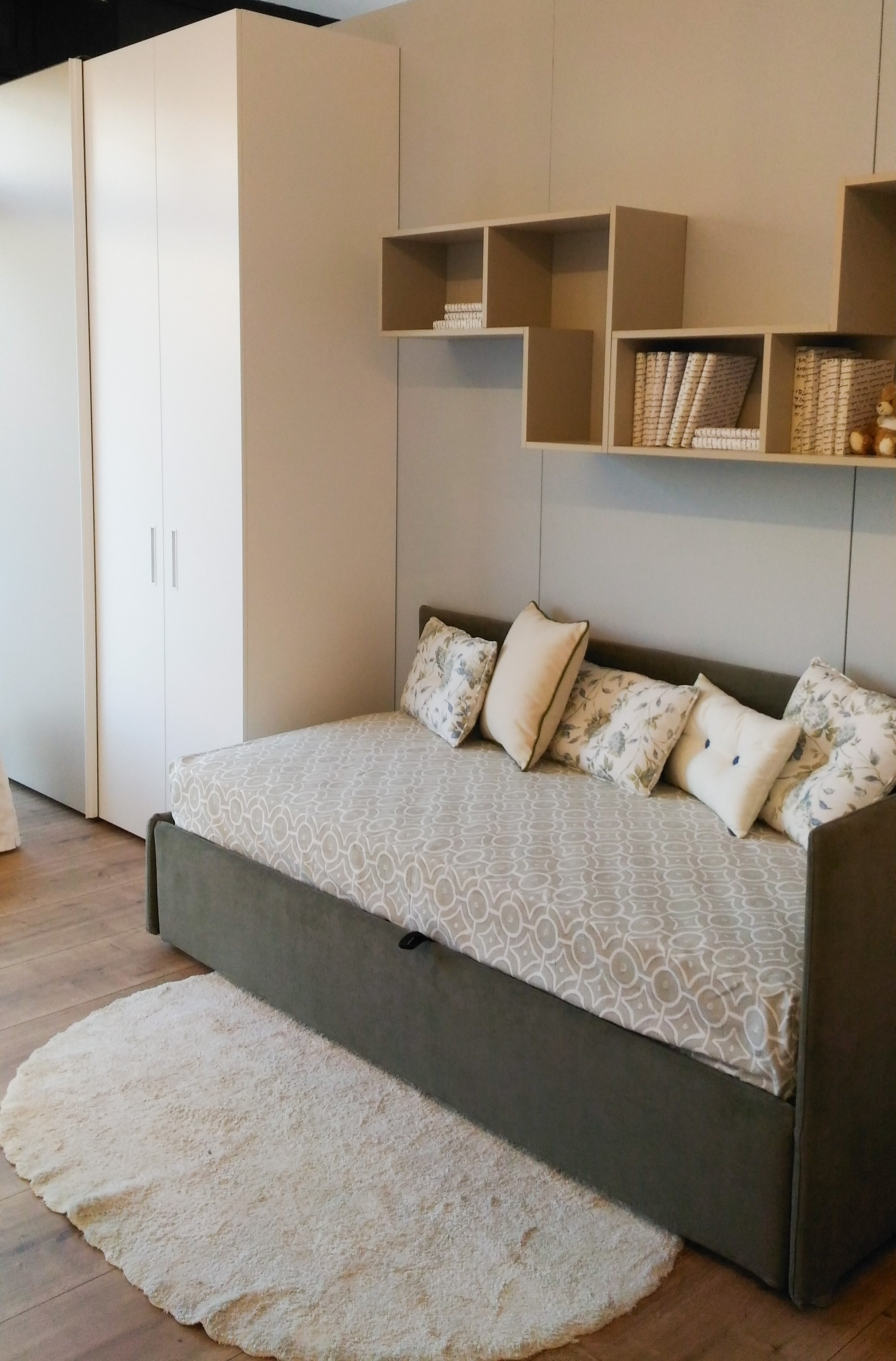 Avete una cameretta stretta e lunga in cui far stare tutto quello che serve a vostra figlia o a vostro figlio? Ecco una nostra proposta per avere tanto contenimento, una scrivania, ed anche un letto per ospitare gli amici. La soluzione si sviluppa su una sola parete di 3 metri e 95 sfruttata in tutta la sua lunghezza per collocarvi i mobili necessari per rendere la stanza confortevole e completa. Il letto proposto è un modello a divanetto imbottito e sfoderabile, con materasso singolo da 90 x 200 cm, comodo anche per i ragazzi più grandi. Il rivestimento in tessuto (o ecopelle su richiesta) conferisce calore alla stanza; il letto inoltre è molto capiente grazie al box contenitore di cui è fornito.