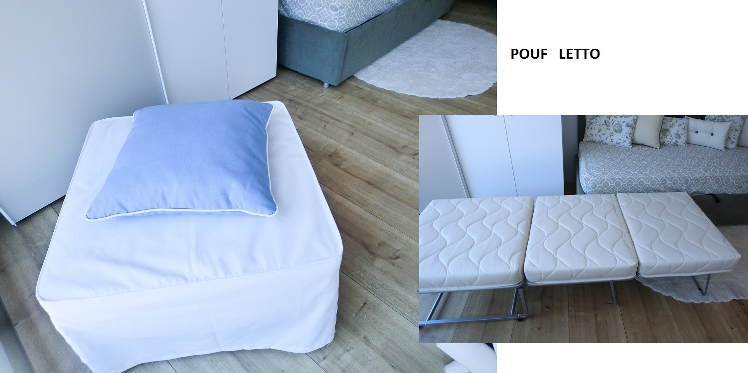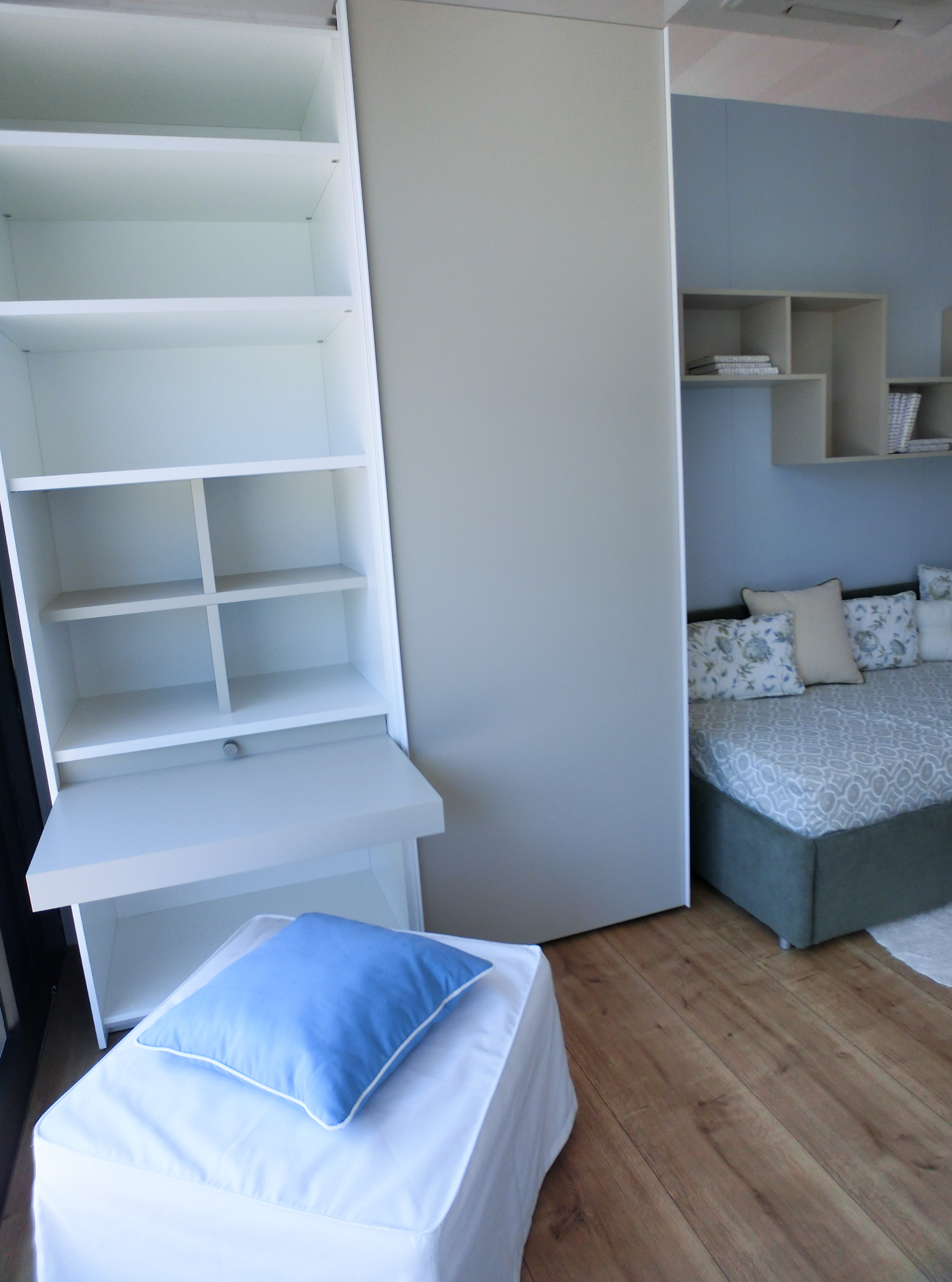 Ulteriore spazio per i libri è stato predisposto sopra al letto con un intelligente gioco di casellari con vani di diverse dimensioni adatti anche a quadernoni e libri di scuola. Invece della sedia, che in alcune situazioni potrebbe risultare d’impaccio, abbiamo preferito inserire un comodo pouf che al bisogno si trasforma in un letto per ospitare parenti od amici.