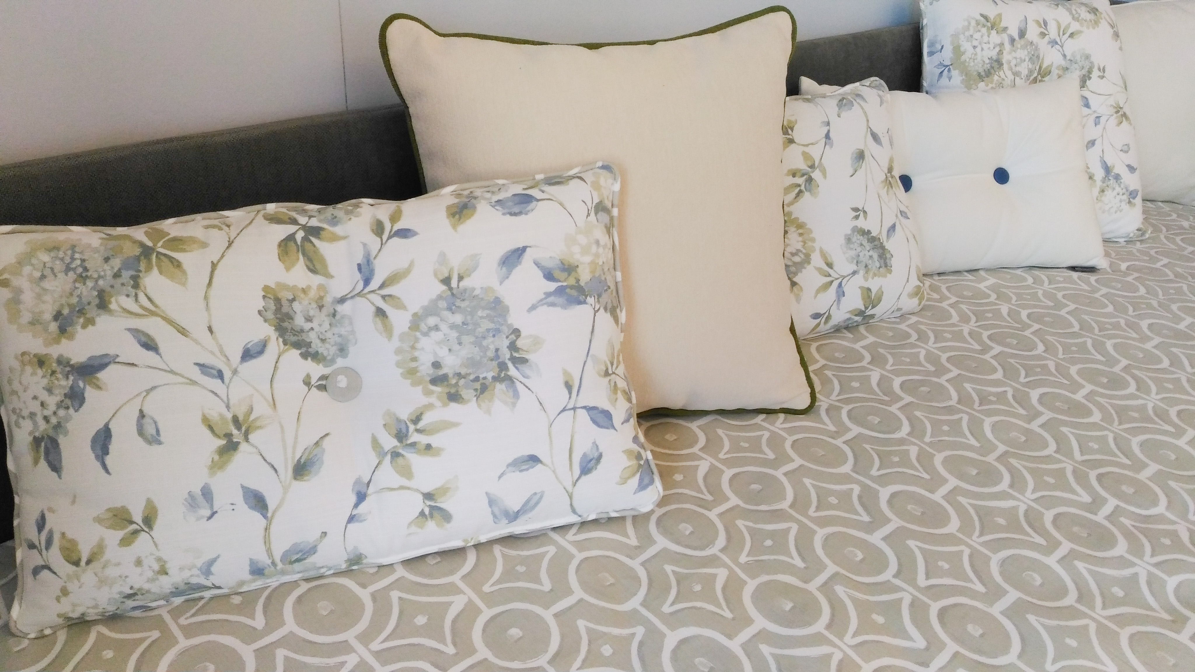 Per dare maggior senso di ampiezza alla stanza abbiamo scelto colori chiari per i mobili (bianco e corda ) e per le pareti (grigio azzurro). Copriletto e cuscini sono stati realizzati appositamente con pregiati tessuti inglesi.