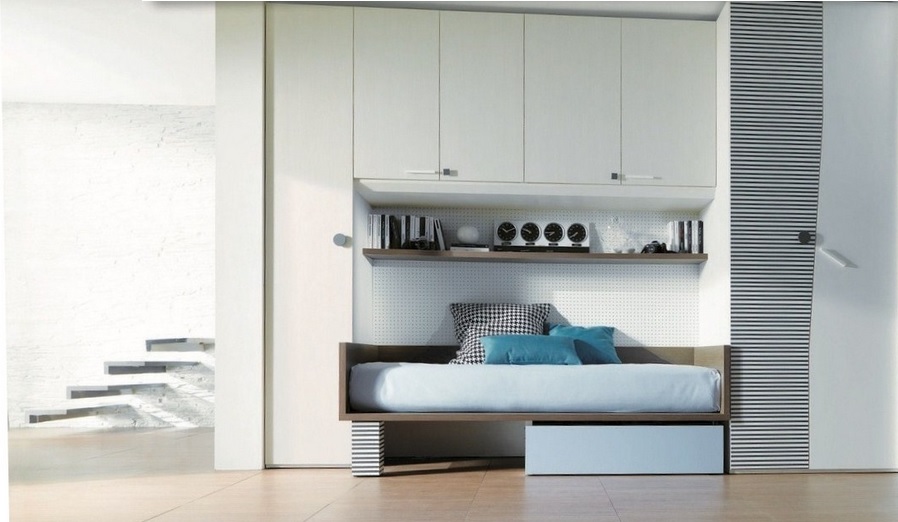 A volte però, se la casa non è molto grande, la stanza dei bambini deve essere usata anche per il contenimento di vestiti ed oggetti di altri membri della famiglia. In questo caso si può optare per la classica soluzione di armadio a ponte (facendo attenzione a scegliere dei ponti che abbiano un’altezza di almeno 150/160 cm da pavimento ad anta perchè così si evita che possano avere un effetto soffocante). I colori dei mobili dovranno preferibilmente essere chiari così da far sembrare la stanza meno piena. La componibilità delle soluzioni a ponte è molto ampia ed è bene ricordare che la parte di armadio sopra il letto non è raggiungibile dai bambini. E’ utile quindi prevedere sempre, dove lo spazio lo consenta, anche un minimo di armadio a terra, eventualmente anche a profondità maggiorata o sotto forma di cabina armadio.