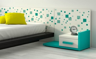 Se invece preferiamo comunque il comodino tradizionale, possiamo conferirgli un tocco di originalità semplicemente appoggiandolo su una panchetta e completandolo con una allegra pannellatura a muro!